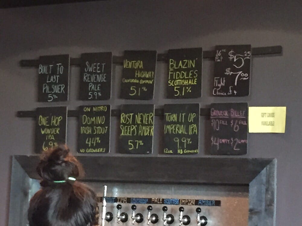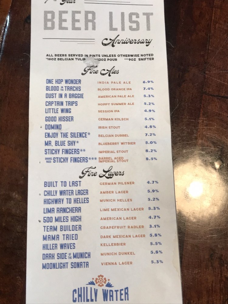 “ Chilly water has a solid, if not incredibly creative, portfolio of beers. Their presentation, however, is extremely creative. The beers are presented in a fun little CD wallet, the ones we all used to have in the 90s. I appreciated that they had multiple lagers on tap. I didn't get food here, but the food menu looked similar, solid, but not incredibly creative. ”